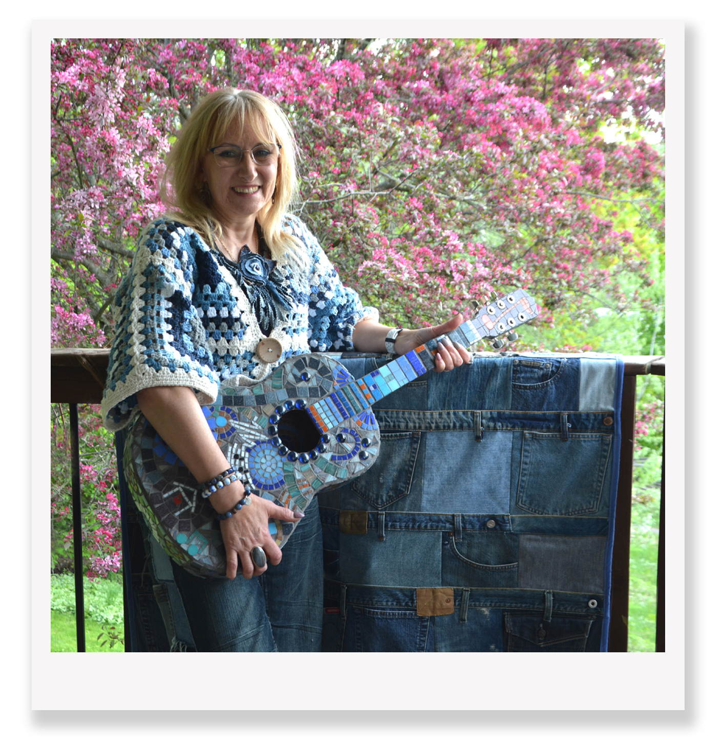 She ultimately, moved on to adding artistic/craft elements to recycled functional objects like furniture, pillows and drapes—changing their look/giving them flare”; and making a big return to quilting—plus adding mosaics (table tops, frames for mirrors, etc. working with glass, ceramics, precious and natural stones) to her crafting roster. And being involved in craft shows/fairs and accepting commissions.